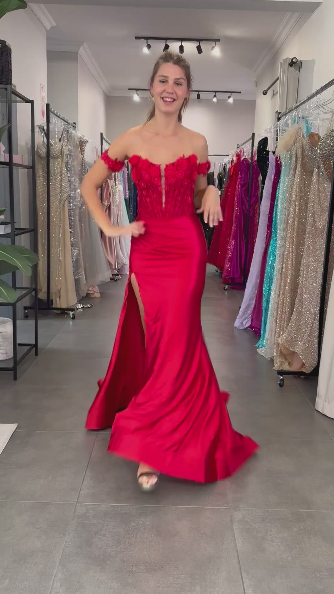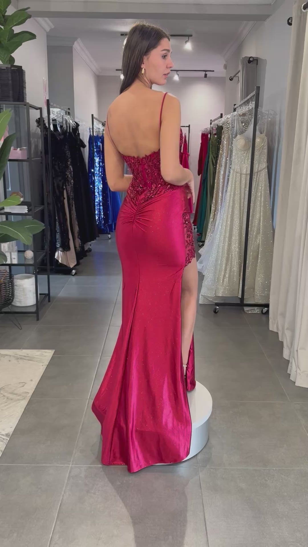 LadivineDEEP RED STRETCH SATIN GLITTER & LACE FITTED GOWN- CDS439 (SHOWROOM SALE)