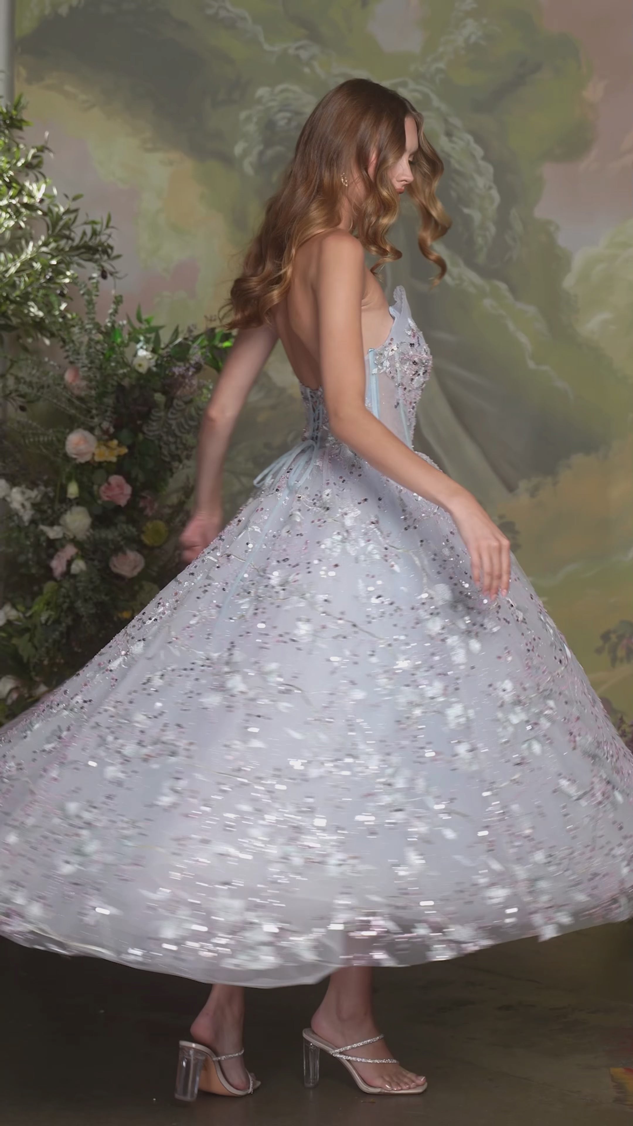 Strapless sweetheart neckline with sequin floral embroidery, structured bodice with supportive boning & zip-up back closure