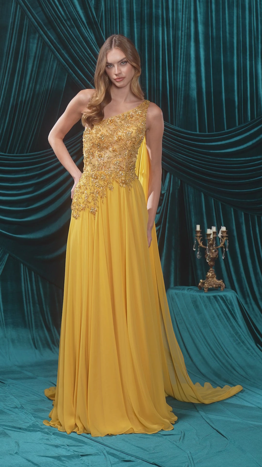 One-shoulder neckline with beaded floral appliqué, attached cape drape, sheer bodice with structured support & flowing skirt for graceful movement