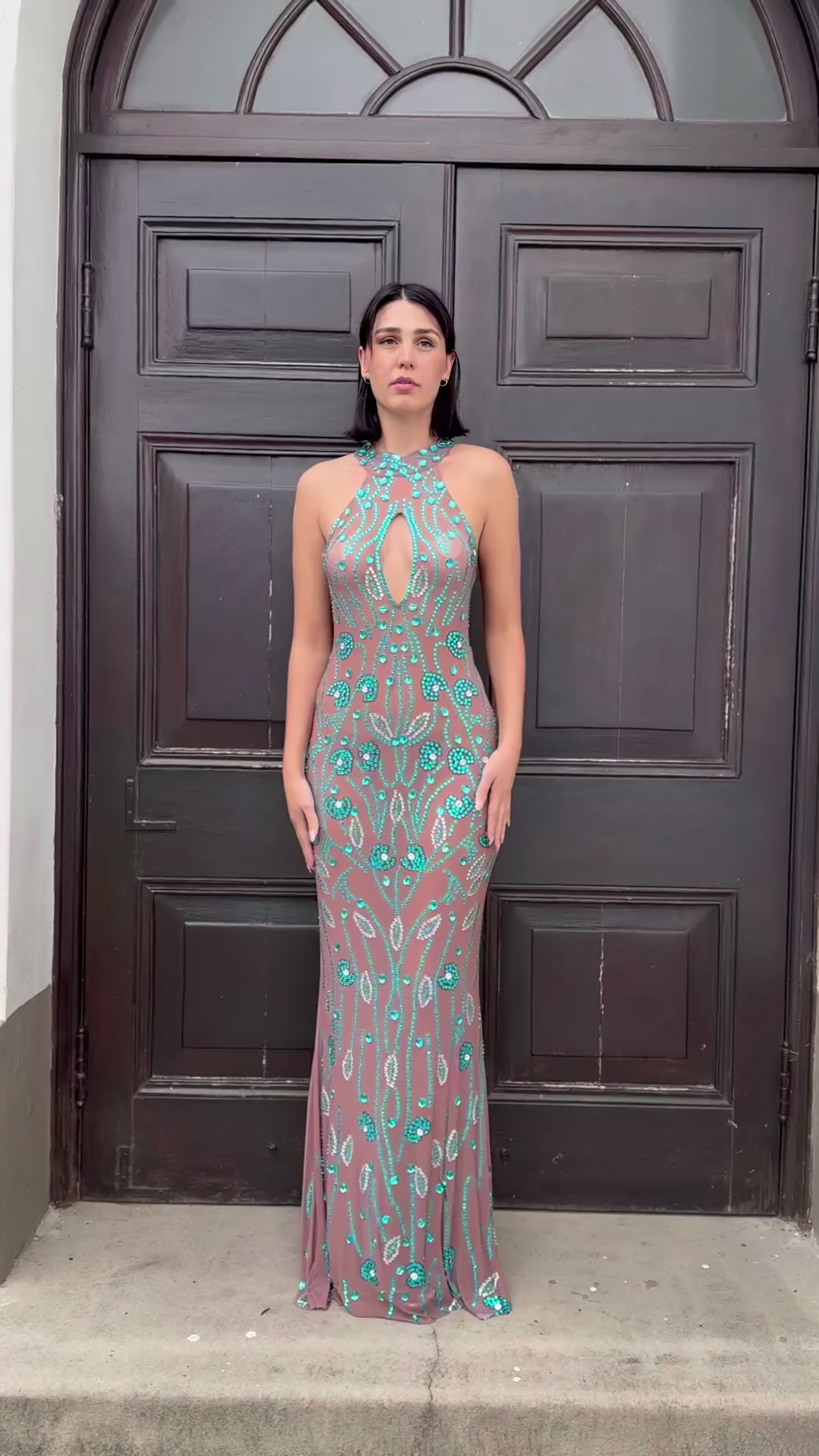 Radiate elegance and confidence in this breathtaking Aqua Crystal Translucent Halter Gown. Designed with a soft nude translucent mesh stretch base, it’s delicately hand-embellished with turquoise and silver crystals that create a luminous, sculpted effect. The high halter neckline and keyhole front add a modern edge, while the fit & flare silhouette ensures a graceful, curve-hugging finish.