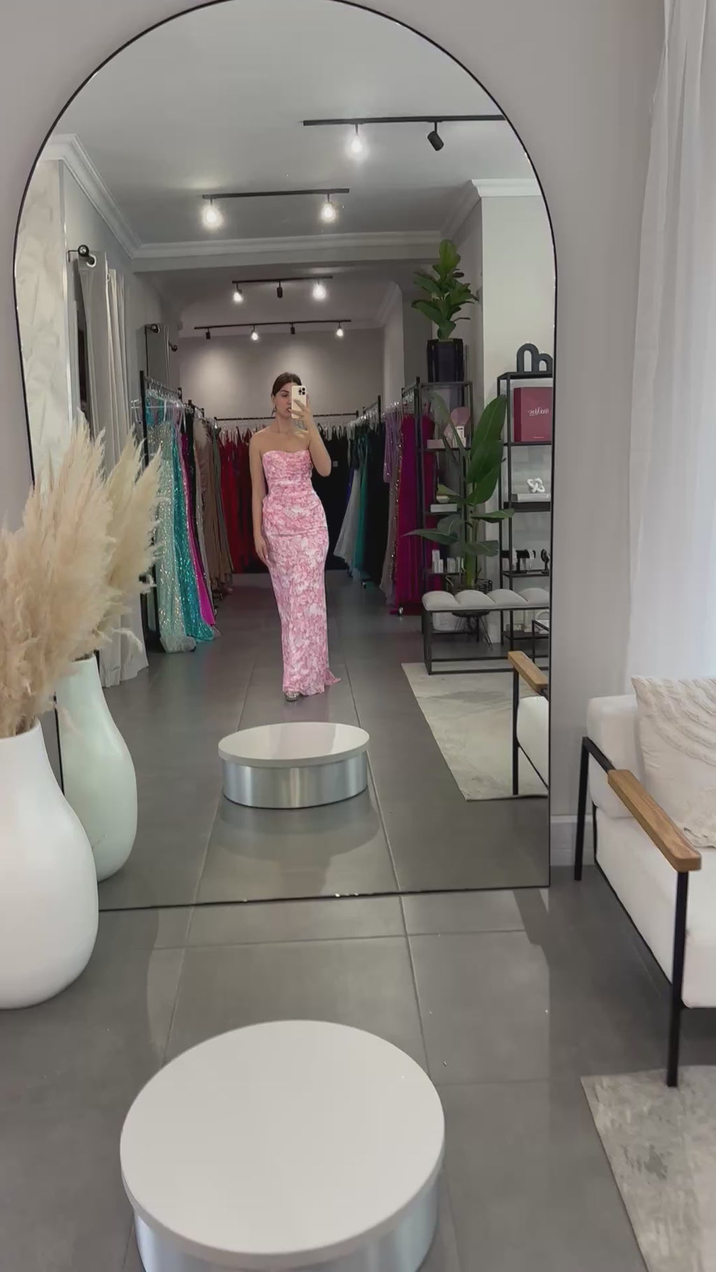 This fitted dress features a strapless scoop neckline and a gathered waistline, crafted from soft satin in a charming floral print. The lace-up corset back closure ensures a perfect fit while adding an elegant touch. Ideal for bridesmaids, wedding guests, and formal events, this dress offers timeless style and sophistication.