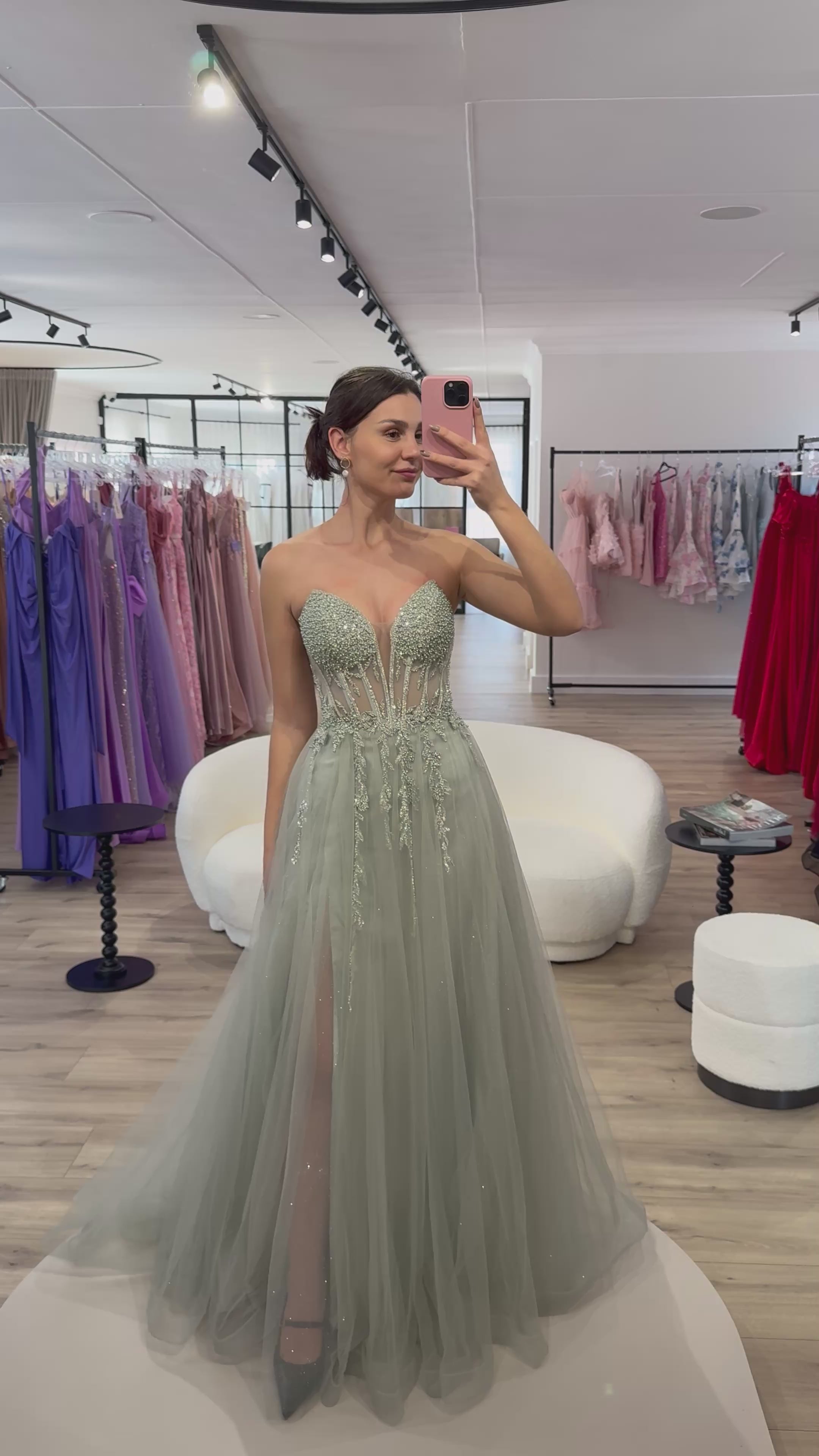 Are you looking for a dress that will truly wow your guests? Look no further than this classic, elegant, and glamorous embellished tulle ball gown! Crafted with beautiful a-line silhouette, the dress features a beaded embellished bodice for a hint of sparkle and a plunging neckline for a dash of allure. The strapless sheer boned bodice ensures that the dress clings to your body in all the right places. To elevate the style, a fabulous layered glitter tulle skirt with a leg slit gives the gown an eye-catching flow. With this stunning dress, you will proudly enter any special event in absolute glamour and elegance.