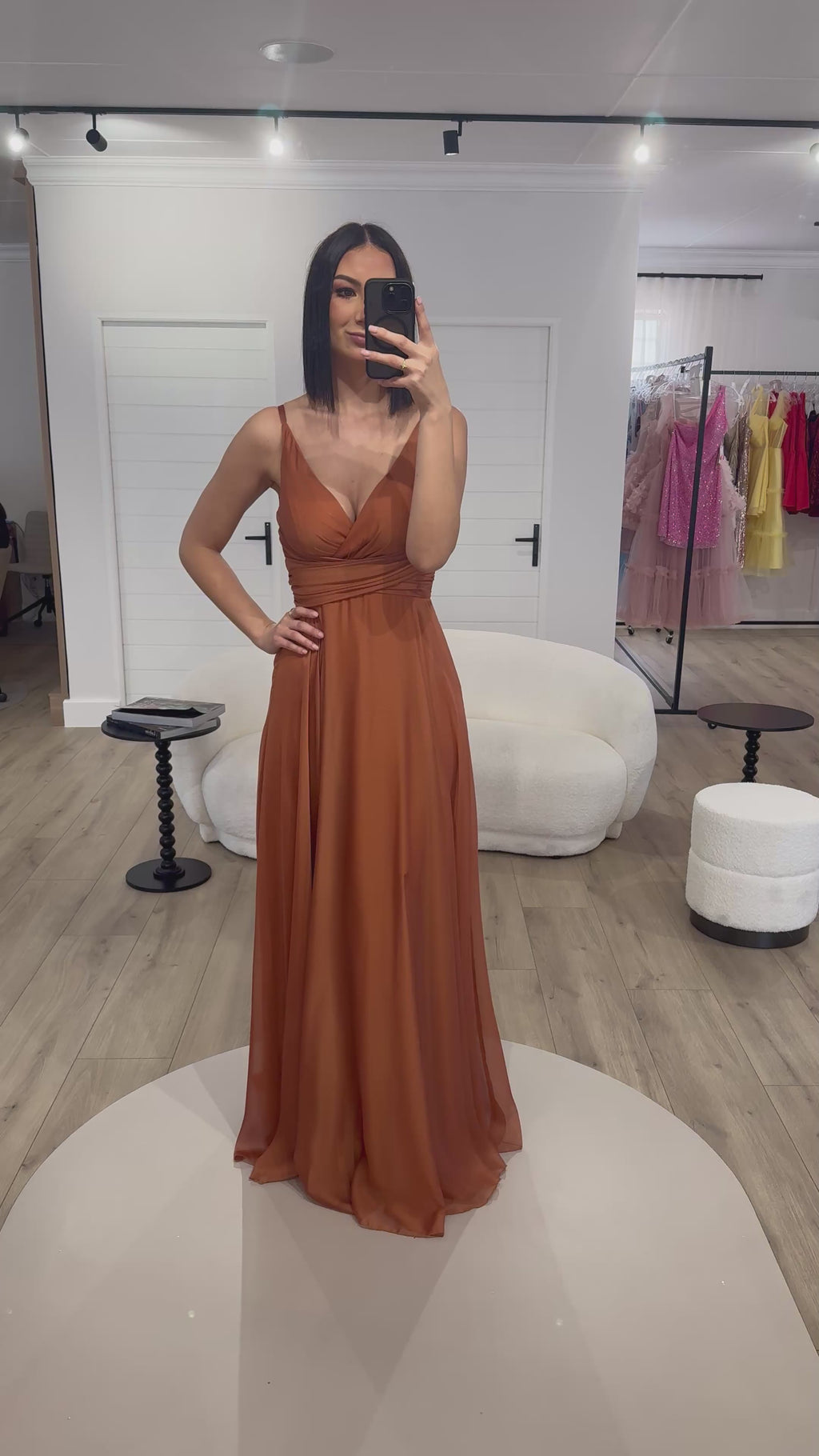 This stunning rust-orange gown features a flattering V-neckline with a delicately ruched bodice that accentuates the waist. The flowing A-line skirt drapes gracefully to the floor, with a daring side slit adding a modern, feminine edge. Crafted from lightweight fabric, it moves beautifully with every step, making it perfect for formal events, weddings, or evening occasions. A timeless silhouette with a touch of allure.