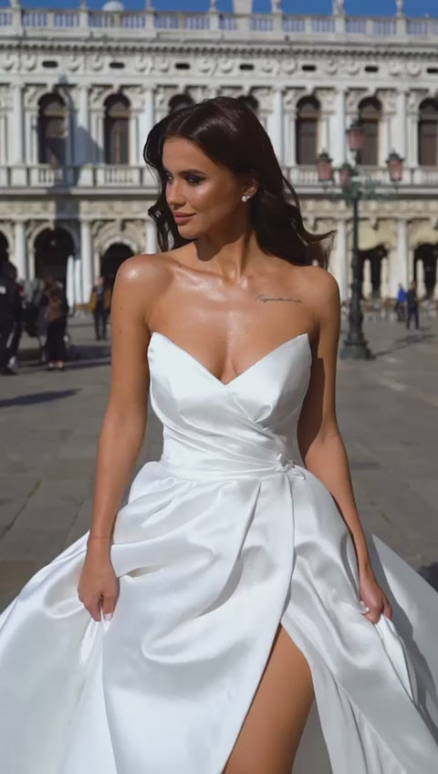 Strapless, v-neckline, cups, delicate belt, elegant bow, open v-back, zipper fastening, pleated skirt, leg slit & train